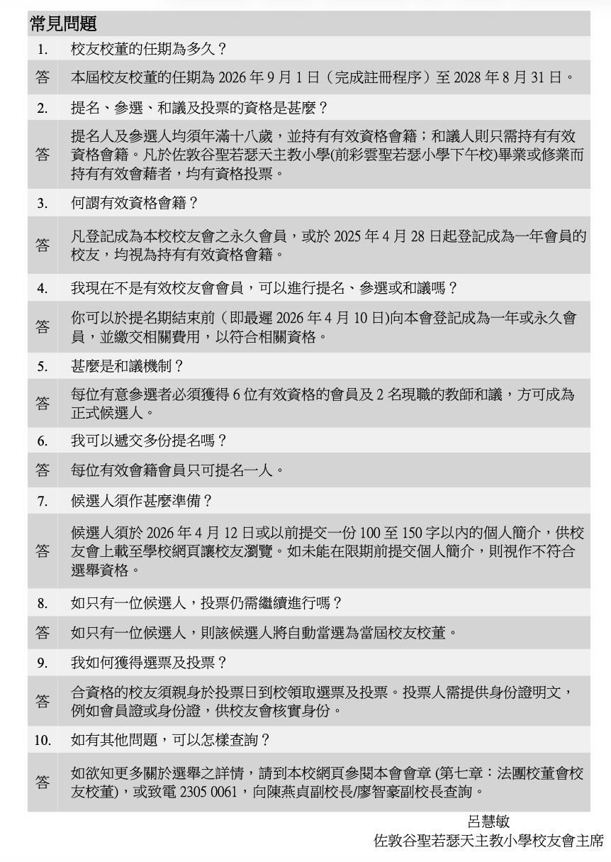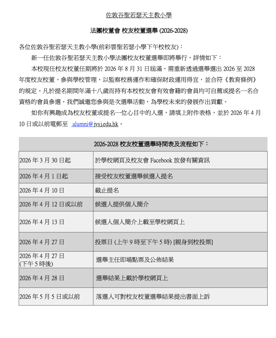 法團校董會 校友校董選舉 (2026-2028) 選舉文件及資料 致各校友信函.pdf 26-28校友校董選舉提名表格.pdf 26-28校友校董選舉候選人簡介.docx 教育條例有關校友校董選舉的規定.pdf 校友校董選舉中須留意的道德操守.pdf 過往資料 24-26 法團校董會校友校董選舉結果