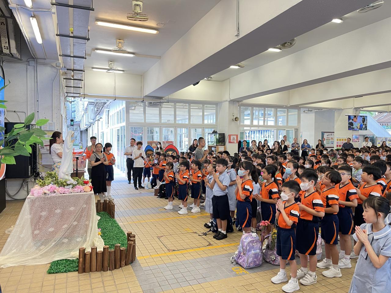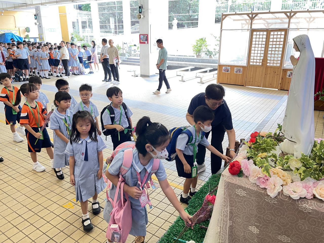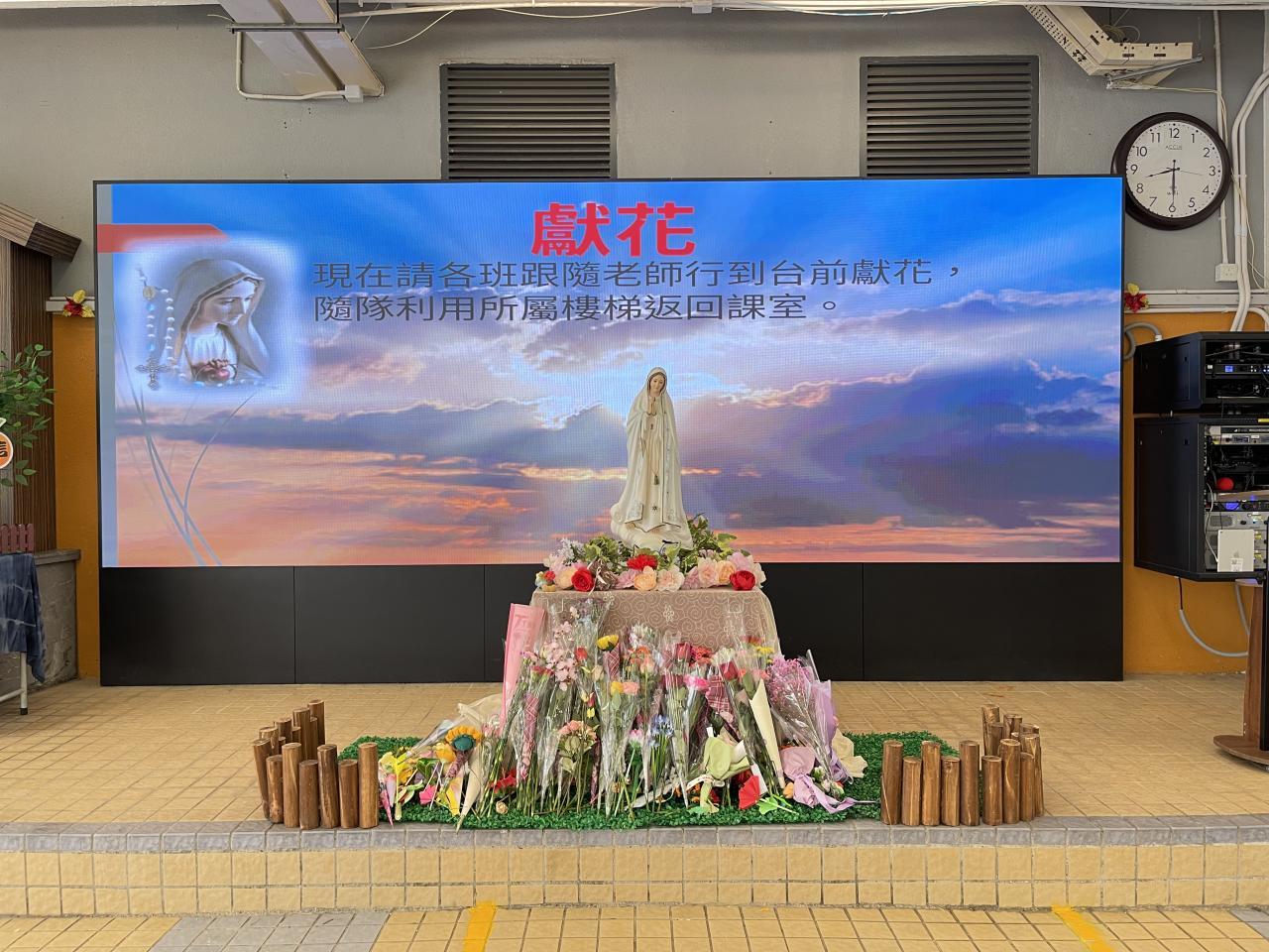 2025-10-08 十月是聖母玫瑰月,我們於10月2日在有蓋操場舉行聖母敬禮。同學代表為我們讀出有關聖母的福音,我們知道聖母是大家的模範,讓我們效法她的芳表,以回報天父給予我們的恩典。敬禮當天,全體同學在老師帶領下一起頌唸玫瑰經,祈禱結束後,同學到聖母像前獻花,以表達對聖母的敬愛。