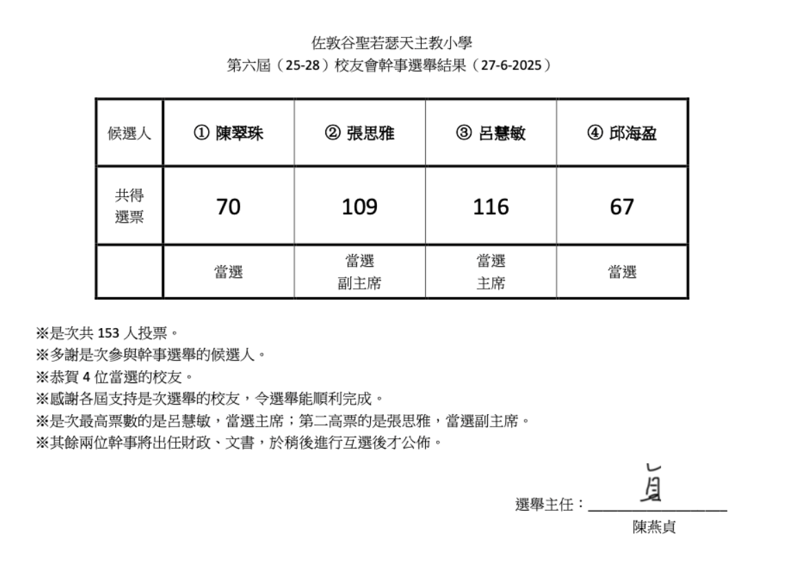 第六屆(25-28)校友會執委會委員選舉結果