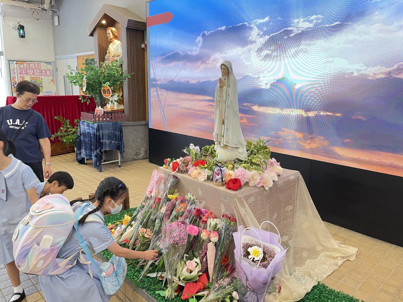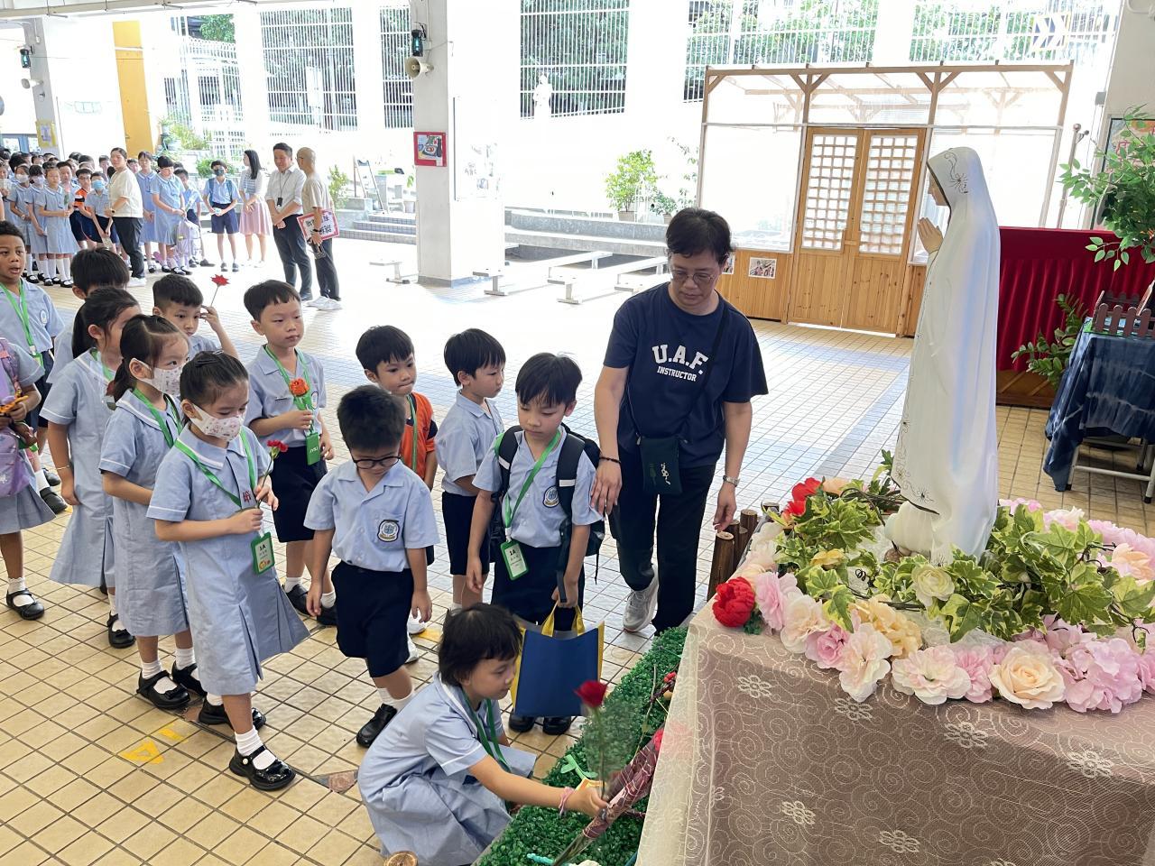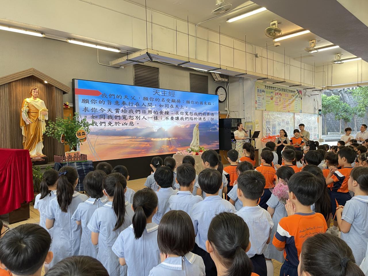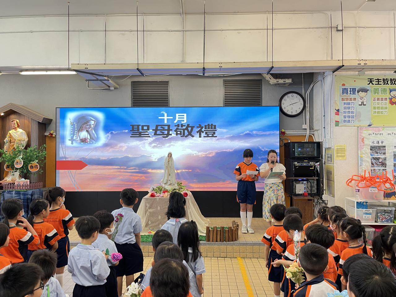 2025-10-08 十月是聖母玫瑰月,我們於10月2日在有蓋操場舉行聖母敬禮。同學代表為我們讀出有關聖母的福音,我們知道聖母是大家的模範,讓我們效法她的芳表,以回報天父給予我們的恩典。敬禮當天,全體同學在老師帶領下一起頌唸玫瑰經,祈禱結束後,同學到聖母像前獻花,以表達對聖母的敬愛。