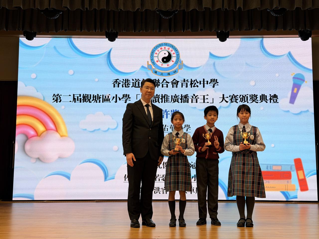 2025-12-14 第二屆觀塘區小學「閱讀推廣播音王」大賽頒獎禮本校9位學生參加香港道教聯合會青松中學 第二屆觀塘區小學「閱讀推廣播音王」大賽,滿載而歸。在12間學校69 份作品中,本校囊括:英語組金獎、英語組銅獎、粵語組金獎、現場投票最受歡迎播音王獎、網上最具人氣播音王獎、優異獎及嘉許獎。欣賞同學們的努力。 最新消息