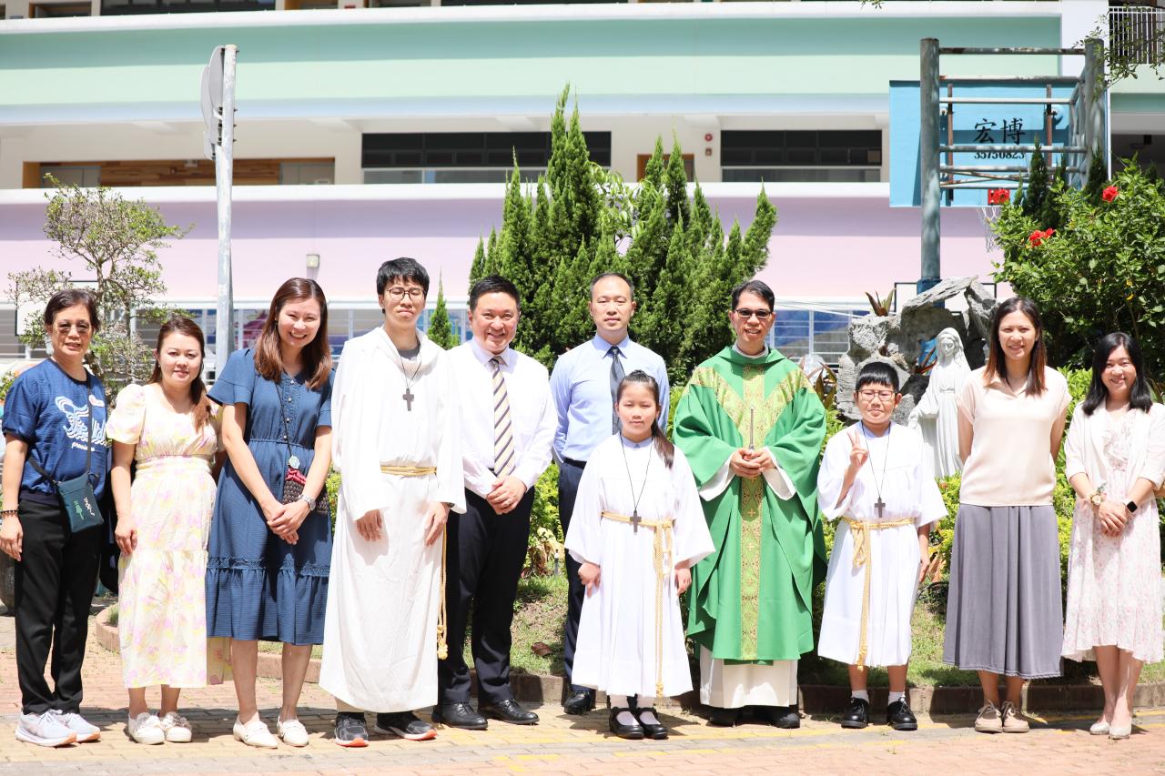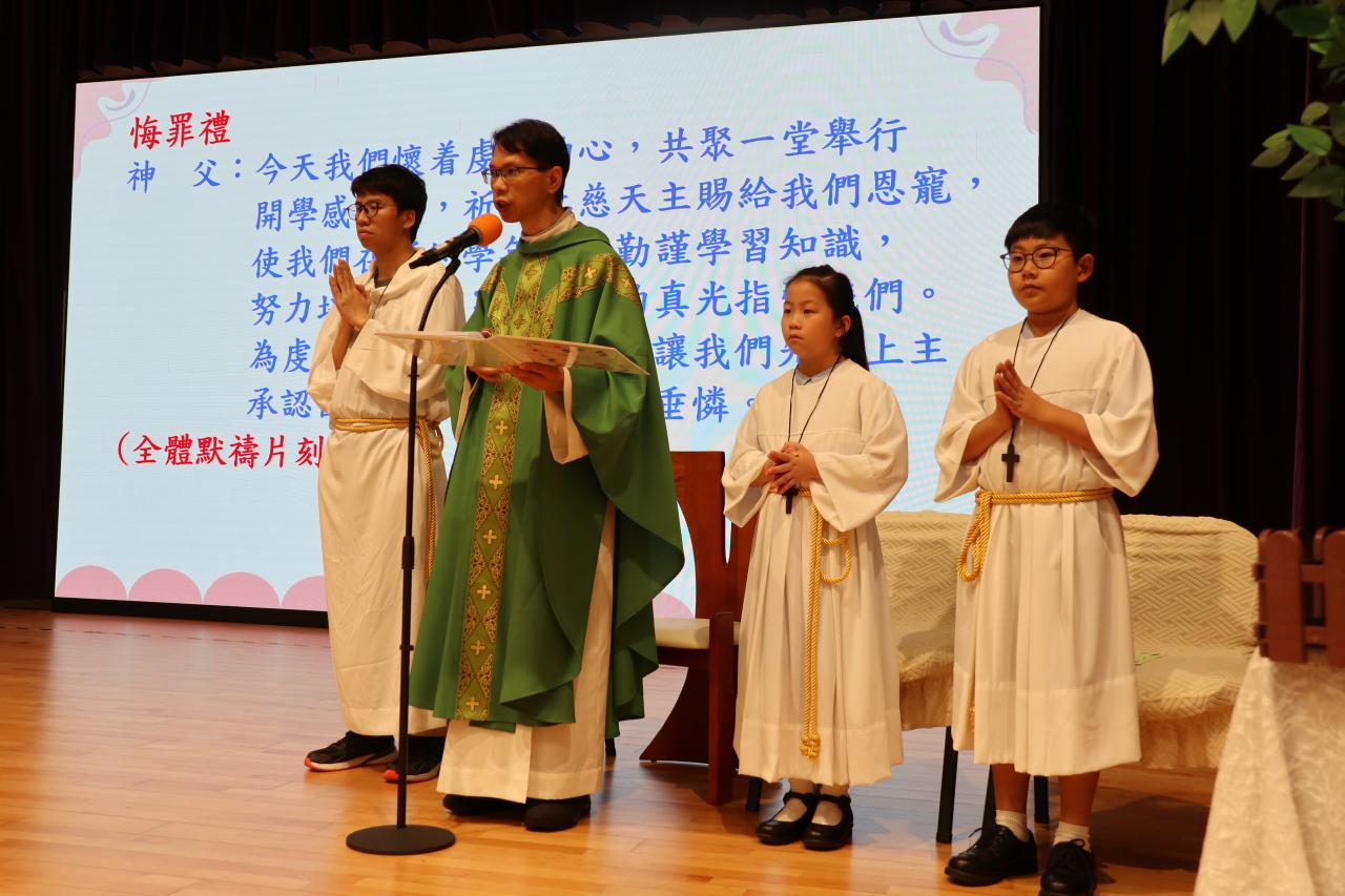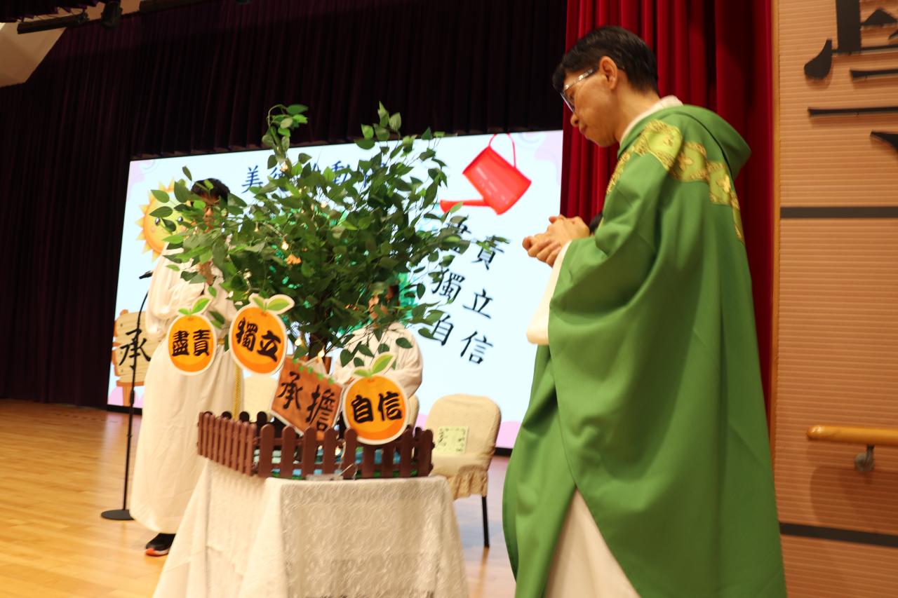為我們主持感恩祭是聖瑪加利大堂助理主任司鐸羅敬業神父,他在彌撒中勉勵同學並見證我們進行美德啟動禮,同學代表把「盡責、獨立、自信」果子掛在「承擔」小樹上。各級代表並為果子灌溉水滴,表示大家在這一年齊起動向美德目標前進。最後,羅神父為我們這棵「承擔」樹亮燈,希望在天主的光照下,同學們可以好好發揮這些品格強項,結出豐盛的果實。